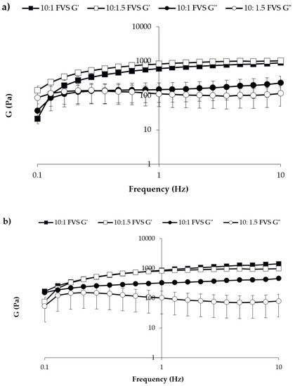 In Figure 9 the elastic storage (G′) and viscous loss (G″) moduli vs. frequency profiles are reported for both mixtures diluted in SVF according to 10:1 and 10:1.5 w/w ratios.