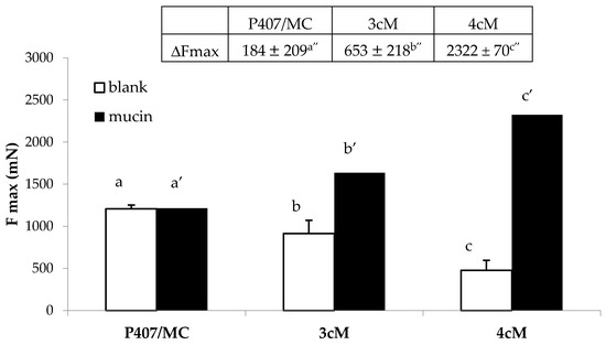 Fmax and ΔFmax values of P407/MC, 3cM (15% w/w P407/1.5% MC/0.5% w/w PEC) and 4cM (15% w/w P407/0.75% w/w MC/0.5% w/w PEC/0.25% w/w XYL) mixtures in presence and in absence (blank) of mucin (mean values ± s.d.; n = 6). One-way ANOVA- multiple range test (p < 0.05): b vs. b′; c vs. c′; a′ vs. b′, c′; b′ vs. c′; a″ vs. b″, c″; b″ vs. c″.