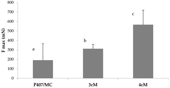 Fmax values of P407/MC, 3cM (15% w/w P407/1.5% MC/0.5% w/w PEC) and 4cM (15% w/w P407/0.75% w/w MC/0.5% w/w PEC/0.25% w/w XYL) mixtures in presence of porcine vaginal mucosa. One-way ANOVA multiple range test (p < 0.05): a vs. c; b vs. c.