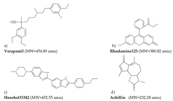 2D representation of the molecules used for molecular docking calculations: (a) Verapamil, (b) rhodamine123, (c) Hoeschst33342, and (d) achillin.