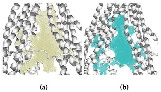 Cavities used to carry out the molecular docking calculations. (a) Cavity of homology model 1 (V = 3900). (b) Cavity of homology model 2.