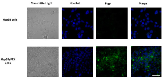 P-gp expression and localization by immunofluorescence microscopy in parental Hep3B and resistant Hep3B/PTX cells. The phase-contrast, P-gp (green), and Hoechst 33258 nuclear counter stain (blue). High levels of P-gp protein were localized in the plasma membrane of resistant cell Hep3B/PTX. Images were acquired at 40X objective plus a 2X zoom in confocal microscope settings. Scale bars, 40 μm.