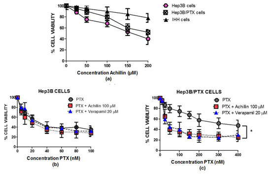 Antiproliferative activity of achillin and PTX alone and in combination in cell lines. (a) Antiproliferative effect at different concentrations of achillin on Hep3B, Hep3B/PTX, and IHH cells. (b) Antiproliferative effect at different concentrations of PTX, alone and in combination with 100 µM Achillin, or 20 µM Verapamil on Hep3B cells. (c) Antiproliferative effect at different concentrations of PTX, alone and in combination with 100 µM Achillin, or 20 µM Verapamil on Hep3B/PTX cells. The absorption values are represented in relation to drug-untreated culture cells (arbitrary value of 100). The results are the mean ± SD of at least three determinations. * p ≤ 0.05.