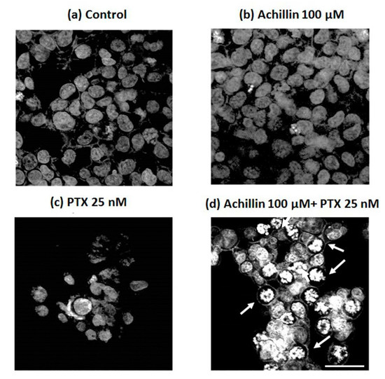 Due the obtaneid results on the potentiated effect of PTX by pretreatment with Achillin in Hep3B/PTX cells, on inhibition of cell viability, and increase in G2M phase of cell cycle. Next, we evaluated the combined effect of Achillin more PTX in the induction of apoptosis associated with changes in DNA fragmentation, and chromatin marginalization, which are characteristics of apoptosis. Accordingly, the DAPI fluorescence analysis (Figure 6) revealed apoptotic nuclear morphological changes, such as chromatin condensation and marginalization (arrows), were evident in cells exposed to Achillin 100 µM + PTX 25 nM treatment (Figure 6d), whereas in the treatment with PTX alone, minimal nuclear alterations in the cells (Figure 6c) were observed. These results suggested apoptosis in cells treated with Achillin before exposure to PTX.