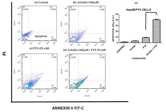 The regulation of achillin and PTX on induced apoptosis of Hep3B/PTX cells was evaluated by quantification of apoptotic cells. Phosphatidylserine externalization, a hallmark of early phase apoptosis, was analyzed using annexin V-FITC/PI double staining and flow cytometry. As shown in Figure 7, the percentage of apoptotic cells was 3.46% in treatment with 100 µM Achillin (Figure 7b) and 9.26% when exposed to 25 nM of PTX (Figure 7c). However, in the treatment of PTX 25 nM plus Achillin 100 µM, the percentage of apoptotic Hep3B/PTX cells was 34% (Figure 7d). The analysis of these results showed a statistically significant increase of 3.39-fold of the apoptotic population compared with 25 nM PTX treatment alone Figure 7e. Altogether, this suggests that Achillin enhances the apoptosis induction of PTX.