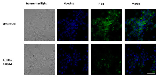 Effect of Achillin (100 µM) on P-gp expression and localization by immunofluorescence microscopy in Hep3B/PTX resistant cells. The phase-contrast, P-gp (green), and Hoechst 33258 nuclear counter stain (blue). Images were acquired at 40X objective plus a 2X zoom in confocal microscope settings. Scale bars, 40 μm.