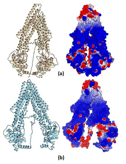 Given that a full 3D structure of the P-glycoprotein of human is unavailable, we needed to generate a representative structure of this protein by means of the homology modeling approach. We used the I-TASSER server to resolve this task; I-TASSER has been ranked as the No. 1 server in the CASP7, CASP8, CASP9, and CASP10 competitions [33,34,35]. We employed the sequence of the human P-glycoprotein (GenBank:AAA59575.1) from the Proteins-NCBI web server. In this work, we used two approximations for the homology modeling, one considering the sequence homology, and the other considering the structural features of the TM helices. For the first case, we employed the crystal structure of mus musculus P-glycoprotein (mP-gp) as a template (PDB:3G61) for the construction of the homology model, because of the high sequence homology (83%) between this protein and human P-glycoprotein (hP-gp), an approximation used by Namseok Kim et al. [36]. On the other hand, Safiulla Basha et al. used the crystal structure of Caenorhabditis elegans P-glycoprotein (cP-gp) as a template (PDB:4F4C) for the construction of the homology model, which has a sequence homology of 46% compared to hP-gp, because of the more reliable orientation of the TM3, TM4, and TM5 helices [37]. To validate our models, a further analysis with PROCHECK server was done Figure S2.