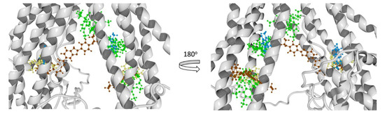 Molecular docking calculations over human hP-gp structures generated in the homology modeling process were done in Molegro Virtual Docker (MVD) 6.0 [39,40]. The cavities were detected by the expanded van der Waals sphere method. The docking calculations were performed over the cavities formed by the twelve TM helices, this region is located between the cytosol and the inner membrane leaflet, with a volume of ~3900 Å3 and ~3700 Å3 for models 1 and 2, respectively, see Figure 2.