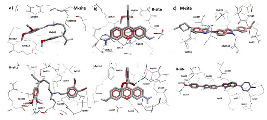 This region is where all the inhibitors of this protein bind, characterized by different drug-binding sites [41]. We employed the minimum energy geometries of all the molecules and evaluated different partial charges schemes (Molegro, electrostatic, and Mulliken). The residues within 3 Å of the cavity were set as flexible (138 residues); 2000 minimization steps for each flexible residue and 2000 steps of global minimization per run were set. The MolDock Simplex Evolution search function, based on an evolutionary algorithm, was used. A total of 50 runs with a maximum of 4500 iterations using a population of 50 individuals per run was set. To calculate the interaction energy, we used the scoring function Moldock Score [GRID]. The GRID resolution was set at 0.2 Å, and the search sphere is fixed at 28 Å. For the energy analysis of the ligand, the electrostatic internal interactions, internal hydrogen bonds and the sp2–sp2 torsions were considered. The method was validated by reproducing the experimental binding mode of the reference inhibitor within the 3G61 crystal structure to validate the mP-gp model, and 4F4C to validate the cP-gp model, with a Root Media Square Deviation (RMSD) of 2.1 Å, and 3.5 Å, respectively, see Figures S3–S5 in Supplementary Material).