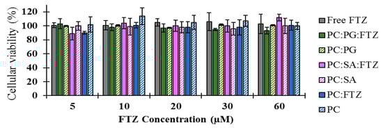Cellular viability of A549 cells, 72 h after incubation with FTZ in the free form (Free FTZ), incorporated in liposomes [PC:PG:FTZ (N4, Table 2); PC:SA:FTZ (N3, Table 2); PC:FTZ (N1, Table 2)] or in unloaded liposomes (PC:PG; PC:SA; PC). FTZ tested concentrations ranged from 5 to 60 µM. Unloaded liposomes were also used as control using the same lipid concentrations as the ones used for the respective FTZ liposomal formulation. The obtained results are expressed as a mean ± SD of sextuplicate values for each concentration and formulation tested.