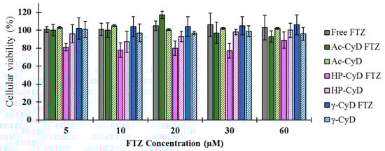 Cellular viability of A549 cells, 72 h after incubation with FTZ in the free form (Free FTZ), incorporated in CyD (Ac-CyD FTZ; HP-CyD FTZ; ϒ-CyD FTZ) or in unloaded CyD (Ac-CyD; HP-CyD; ϒ-CyD). FTZ tested concentrations ranged from 5 to 60 µM. Unloaded CyD were also used as control using the same amount as the ones used for the respective FTZ CyD complex. The obtained results are expressed as a mean ± SD of sextuplicate values for each concentration and formulation tested.