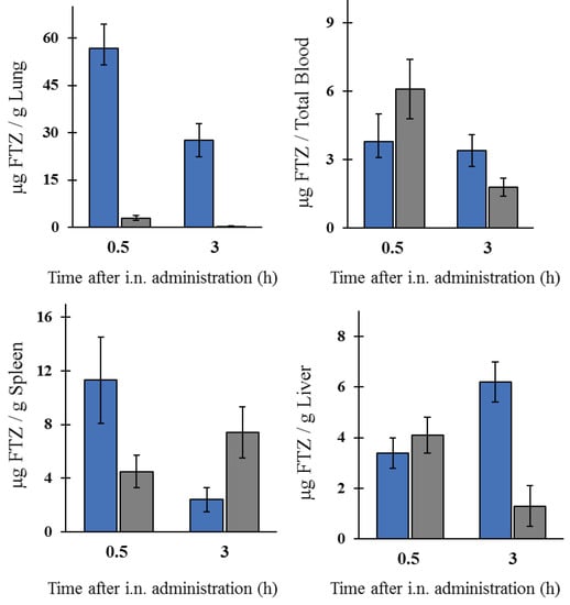Biodistribution profile of FTZ in the free form (grey columns) or incorporated in liposomes (blue columns) after i.n. administration. FTZ levels in lung, blood, spleen, and liver. The obtained results are expressed as a mean ± SD of three animals per analyzed time and formulation. Mice received the formulation and were sacrificed 0.5 or 3 h after i.n. administration. The obtained results are expressed as mean ± SD (n = three mice per selected time and per FTZ formulation).