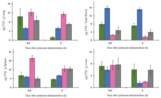 Biodistribution profile of FTZ in the lung, blood, spleen, and in the liver after inhalation of FTZ in free form (grey columns) or incorporated in Ac-CyD (green columns), γ-CyD (blue columns), or in HP-CyD (pink columns). Mice were exposed to formulations for 5 min and were sacrificed 0.5 or 3 h after pulmonary delivery of dry powders under study. The obtained results are expressed as mean ± SD (n = three mice per selected time and per FTZ formulation).