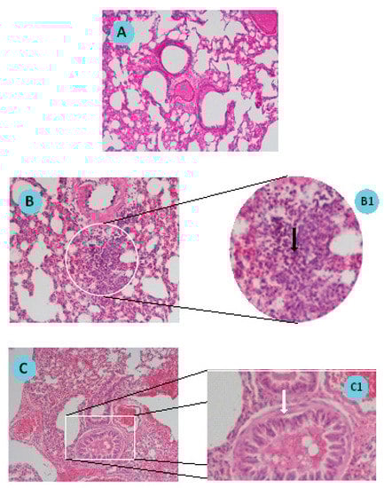 Figure 7A presents a lung section where no microscopic changes are observable, as expected for a lung from a naïve animal. Figure 7B,C represent two aspects of the development of asthma in mice. Figure 7B shows cellular infiltration with an increased number of eosinophils in a lung section of an induced animal. The respective enlarged image (Figure 7B1) shows the eosinophils pointed with the black arrow. Figure 7C shows bronchioles with hyperplasia of the smooth muscle layer. In Figure 7C1, muscle hyperplasia is signed by a white arrow. Histologic examination of haematoxylin and eosin stained lung specimens of induced animals confirmed the establishment of the asthma model in mice.