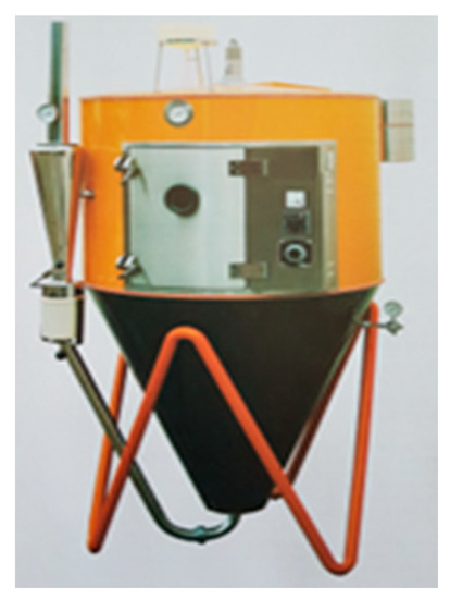 The pilot scale spray dryer (APV Anhydro AS, Søborg, Denmark) used for spray drying of prepared liquid feed is presented in Figure 1. A laboratory peristaltic pump was used to transfer the liquid feed into the drying chamber. For each run, 2 L of liquid feed was dried. Liquid feeds were dried at inlet temperature, Ti = 130 ± 5 °C, while outlet temperature, T0 was maintained at 75–80 °C. During the production of the dry extract (powder), rotary disk, within atomizer, delivered speed from 20,000 to 21,000 rpm. The obtained powder was separated from heating medium in a cyclone and collected in glass bottles, sealed and kept protected from air and humidity. The particle production efficiency (i.e., powder recovery) is determined gravimetrically as ratio of mass of the powder obtained in the collecting vessel after spray drying and mass of total solids measured in the liquid feed. Process efficiency is expressed as the weight percentage.