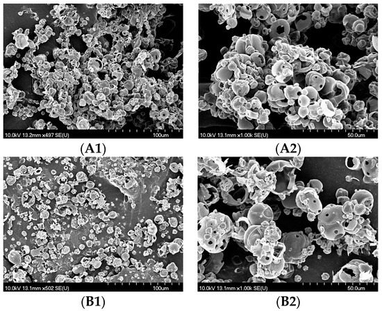 Micrographs of the MVPs particles using SEM with 500× magnification (A1, B1) and 1000× magnification (A2, B2) where A1, A2 represent MVP 0% MD and B1, B2 represent MVP 10% MD.