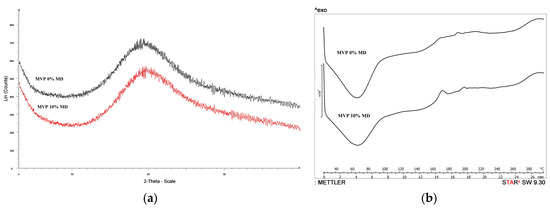 (a) XRPD patterns of the 0% MD MVP and 10% MD MVP; (b) DSC curves of the 0% MD MVP and 10% MD MVP.