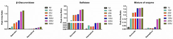 In most cases, flavonoids such as quercetin and resveratrol could be converted into glucuronidated and sulfated conjugates in vivo. As a result, the total concentration of both unconjugated and conjugated flavonoids was generally determined after hydrolysis. Various hydrolysis methods using β-glucuronidase and/or sulfatase was employed to transform glucuronidated and sulfated conjugates to the corresponding free forms [13]. In previous methods, the amount of β-glucuronidase and sulfatase varied among different procedures of enzymatic hydrolysis, likely due to diverse sources of biological samples with varying concentrations of glucuronide and sulfate conjugates as well as different enzymatic activities of β-glucuronidase and sulfatase. For example, Lee et al. employed an enzymatic hydrolysis method for quercetin glucuronide and sulfate conjugates using 150 units of sulfatase and 17,000 units of glucuronidase [14], while another hydrolysis procedure using 2.5 units of sulfatase and 10 units of glucuronidase was reported [15]. To the best of our knowledge, this was the first report to evaluate hydrolysis effectiveness of quercetin and kaempferol conjugates in beagle dog plasma under varying amount of β-glucuronidase, sulfatase, or the combination of β-glucuronidase and sulfatase. As shown in Figure 1, both β-glucuronidase and sulfatase demonstrated an increasing hydrolysis potency for quercetin conjugates with individual enzyme amount (from 1 unit to 200 units), but tended to reach a plateau at 200 units. Similar results were observed for kaempferol. As expected, mixed hydrolase exhibited higher hydrolysis potency than the single enzyme alone. Finally, mixed hydrolase, including 200 units of each enzymes, was selected to ensure that the conjugated metabolites of quercetin and kaempferol can be completely hydrolyzed in beagle dog plasma.