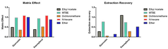 Stabilizers are often required to improve the stability of flavonoids of interest [16]. According to previous reports, the pH of biological samples was maintained at pH5 using acetic acid [15]. Then, the stability of quercetin and kaempferol was assessed after adding different stabilizers such as ascorbic acid, sodium bisulfite, or combination of ascorbic acid and citric acid followed by 2 h incubation under room temperature. The results are shown in Table 1. Quercetin and kaempferol were not stable by only controlling the pH, but the remaining three strategies were able to stabilize both analytes of interest. Finally, 0.5 M acetic acid containing 2 mg/mL ascorbic acid was chosen as stabilizer. Thereafter, the liquid-liquid extraction (LLE) method employing five different organic extractants including ethyl acetate, MTBE, dichloromethane, n-hexane, and ether was tested. The results are shown in Figure 2. Based on a matrix effect and extraction recovery, MTBE was selected as the extraction solvent for sample preparation.
