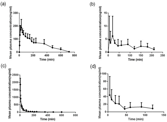 The mean total plasma concentration versus time curves of (a,c) quercetin and (b,d) kaempferol in beagle dogs following either (a,b) oral (100 mg/kg) or (c,d) intravenous (5 mg/kg) administration of tartary buckwheat extracts. Data are represented in mean ± S.D., n = 6.