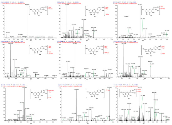 In previous study, 16 metabolites have been detected in rat biological matrices including feces, urine, bile, and plasma after oral administration of 240 mg/kg tartary buckwheat extracts [24]. However, the metabolite profiling of tartary buckwheat extracts in beagle dogs has not been elucidated until now. In the current study, a dose of 100 mg/kg tartary buckwheat extracts was co-administered with ethanol to beagle dogs. Metabolites were identified according to the following steps: (1) chemical database construction including mass weights, elemental compositions, and structure information of chemical components originated from tartary buckwheat extract; (2) understanding of the mass fragmentation information of the typical chemical components in tartary buckwheat extract; (3) screening of potential metabolites by comparing the mass chromatograms and characteristic fragment ions between the dosing and blank control group. In addition to reported metabolites such as methylated, glucuronidated and sulfated quercetin and kaempferol [18,25], a total of nine novel metabolites were detected and further characterized using the above-mentioned strategy. Three novel metabolites were identified and characterized in each biological matrix, including urine (M1, M7, and M8), feces (M3, M5 and M9), and plasma (M2, M4, and M6). The measured masses, mass errors, characteristic product ions of the proposed metabolites, and predicted metabolic pathways are summarized in Table 3. The MS/MS (MS2) spectra of metabolites detected in urine, feces, and plasma are shown in Figure 4.