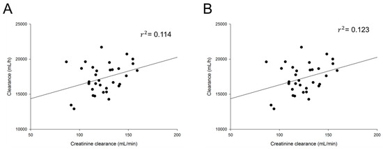 Relationship between individual predicted pharmacokinetic parameters and subject‘s characteristics. (A) Clearance of total cefprozil according to creatinine clearance; (B) Clearance of cis-cefprozil according to creatinine clearance.