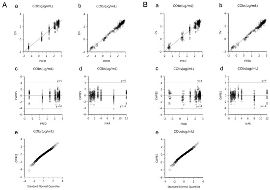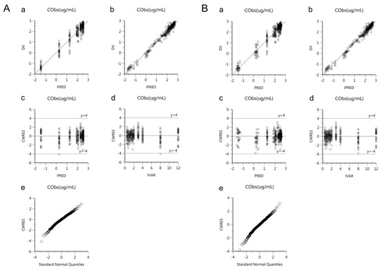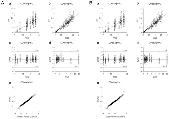 Goodness-of-fit plots of base model (A) and final model (B) for trans-cefprozil. (a) Observed plasma concentrations (DV) against population predicted concentrations (PRED); (b) Observed plasma concentrations (DV) against individual predicted concentrations (IPRED); (c) Conditional weighted residuals (CWRES) against population predicted concentration (PRED); (d) Conditional weighted residuals (CWRES) against time (IVAR); (e) Quantile-quantile plot of components of conditional weighted residuals.