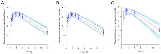 Visual predictive check of the final model for total cefprozil (A), cis-cefprozil (B), and trans-cefprozil (C). Dots indicate observed concentrations. Black dashed lines represent 5th, 50th, and 95th percentiles of the predicted concentrations; Blue shaded regions are 95% confidence intervals for predicted 5th and 95th percentiles. Red shaded regions are 95% confidence intervals for the predicted 50th percentiles.