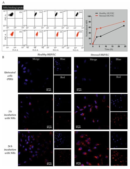 Rhod dye was covalently linked to the hydroxyl groups of NHs [] and the obtained fluorescent NHs were used for the binding/internalization kinetics study in healthy or oxidatively stressed HUVECs by flow cytometry (Figure 1A) and confocal microscopy (Figure 1B). Flow cytometry analysis evidenced that both, healthy and oxidatively stressed HUVECs, incubated for 3 h with Rhod-NHs, showed a significant increase in fluorescence intensity, indicating an evident binding/uptake of NHs within the cells, followed by a plateau up to 6 h; after 24 h the fluorescence intensity of HUVECs increased again (Figure 1A). Interestingly, the fluorescent intensity of oxidatively stressed HUVECs was almost two-fold higher than that of healthy HUVECs, at all the tested time points, suggesting that HUVECs are able to bind/take up more NHs in stress conditions. According to confocal microscopy analysis, NHs are located into vesicle-like structures in the perinuclear area, suggesting an intracellular location of NHs (Figure 1B). A similar outcome was already obtained, by incubating human keratinocytes (HaCaT) with Rhod-NHs []. Moreover, micro-graphs of oxidatively stressed cells showed a higher red fluorescence than that observed for healthy cells, confirming that HUVECs take up more NHs in stress conditions.