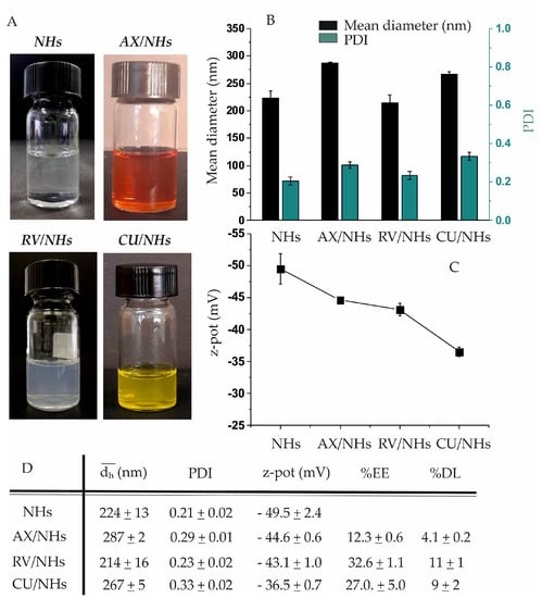 3.2. Preparation and Characterisation of AX/NHs, RV/NHs and CU/NHs Systems