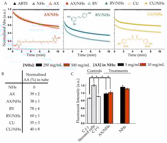 Once loaded into NHs, the AA of AX, RV and CU were checked with the ABTS test [] and compared to that of the free drugs. ABTS assay measures the ability of the antioxidant molecules to scavenge the ABTS•+, which is generated by the reaction of ABTS salt with a strong oxidising agent, such as potassium persulfate. The reduction of the blue-green ABTS•+ coloured solution (due to the presence of hydrogen-donating antioxidant molecules) is due to the suppression of its characteristic absorption spectrum at λ = 730 nm. Results evidenced that free NHs do not show any AA, whilst RV has the highest AA, followed by CU and finally by AX. The AA of AX molecules did not change when they were loaded into NHs (Figure 3A,B); conversely, loaded molecules of RV and CU lost 23 and 27% of AA, respectively, compared to those of the starting drugs. This result may be due to the longer encapsulation process (14 h for RV and CU and 5 h for AX), needed to obtain stable nano-formulations with suitable physico-chemical properties. The highest AA was evidenced by RV/NHs (60%), whilst AX/NHs and CU/NHs showed similar AA (38 and 40%, respectively).