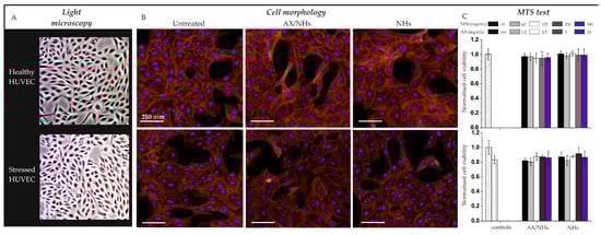 To determine the effects of AX/NHs and free NHs on cell viability, healthy or oxidatively stressed HUVECs (Figure 4A) were incubated with AX/NHs or free NHs over 24 h, at several concentrations (ranging from 31 to 500 µg mL−1 (NHs) and from 1 to 16 µM (AX)). Both cell morphology (Figure 4B) and MTS (Figure 4C) showed that nano-formulations were not toxic to healthy or oxidatively stressed HUVECs, as neither HUVECs morphology nor metabolism was significantly affected by any of the tested concentrations after 24 h (Figure 4B,C). However, stressed HUVECs appear to be slightly smaller and a bit less metabolically active (18%) than healthy HUVECs.