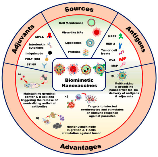 Biomimetic nanovaccines are ideal vaccine candidates, as they have unique physicochemical parameters, such as size, shape, and biomimicking property. This feature makes them a versatile delivery system for the delivery of antigens and adjuvants. The main advantage of nanovaccines is their ability to incorporate both antigens and adjuvants within a single particle to produce maximum stimulation. The biomimicking property of these nanovaccines reduces interactions with RES cells, provides longer circulations, and prevents the burst release of adjuvants from its nano-formulation. The synthesis methods and the choice of material used for NP formulations make the nanovaccine flexible, so that it can incorporate different molecules, such as proteins, polysaccharides, lipids, polymers, and nucleic acids. The NP localization can be enhanced by modifying the NP surface with ligands that have specificity to immune cell receptors [95]. Moreover, antigens and adjuvants can be loaded into NPs either individually or for a combinatorial approach, and protect its molecule integrity from different enzymes, such as nucleases and phosphatases [96]. Besides these advantages, NP formulation also prevents adjuvants from degradation, protects the body from potential systemic toxicity caused by the premature release of adjuvants, and enhances immune response through extended cargo release [19].