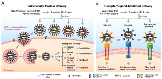 Schematics of the generation of functional virus-like particle (VLP) and (A) the delivery of proteins of interest intracellularly, and (B) by receptor/ligand-mediated protein delivery. Reproduced with permission from Ref. [57]; Copyright © 2011, National Academy of Sciences.