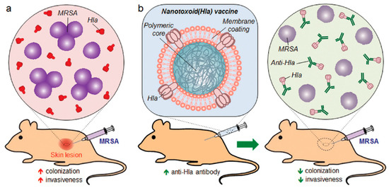 A toxoid is a chemically or physically modified toxin that is no longer harmful but retains immunogenicity. Wang et al. [20] developed a nanotoxoid that consists of RBC membrane-coated polymeric NPs, and the membrane coating acts as a substrate for the pore-forming staphylococcal α-hemolysin (Hla) nanotoxoid, thereby effectively triggering the formation of germinal centers, and inducing high anti-Hla titers. Further, the nanotoxoid formed showed superior protective immunity against methicillin-resistant Staphylococcus aureus (MRSA) skin infection (Figure 3) [20].