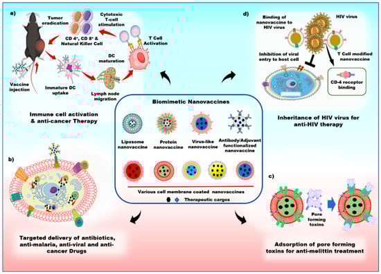 Schematics of the various applications of biomimetic nanovaccines. a) Biomimetic nanovaccines with adjuvants, antigens, and antibodies can trigger dendritic cell maturation and stimulate cytotoxic T-cell to induce a strong immune response against tumor, b) biomimetic nanovaccines can actively target the cancer cell, and effectively deliver the therapeutic drugs, c) biomimetic nanovaccines act as a natural substrate for the adsorption of pore-forming toxins, and d) biomimetic nanovaccines can bind to human immunodeficiency virus (HIV) viruses with CD-4 receptors, and prevent the host cell from HIV virus infections.
