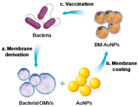 The use of bacterial membranes as vaccination materials has gained considerable interest. They can stimulate innate immunity and promote adaptive immune responses by exhibiting different pathogen associated-molecular patterns (PAMPs) for a large number of immunogenic antigens with adjuvant properties [83]. Camouflaging NPs with covering bacterial membranes results in the preservation of bacterial characteristics, and thus helps in mimicking natural antigen presentation by bacteria to the immune system. Gao et al. [83] reported a bacterial membrane coated NP for antibacterial therapy, in which gold NPs were coated with bacterial outer vesicles. In this study, they chose E. coli bacteria, obtained its outer membranes, and coated gold NPs of 30 nm size with them; they found that this could induce rapid activation and DC maturation in the lymph nodes. Further, vaccination with these NPs produced long-lasting and robust antibody responses [83].