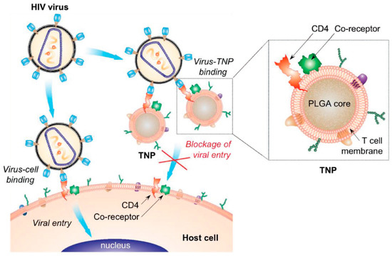 Cell-membrane-coated NPs have also emerged as an effective platform to treat HIV infections. HIV infection explicitly targets T-cells, and reduces the immune cells by viral killing, where uninfected cells lead to the apoptosis. Wei et al. [47] developed a T-cell membrane-coated biomimetic nanovaccine to neutralize the viral infection (shown in Figure 6). The viral fusion of the virus and immune cells is started by the interaction between the CD 4 receptor and the glycoprotein (gp120) through the C-C chemokine receptor 5 (CCR5) and C-X-C chemokine receptor type 4 (CXCR4) [113]. The T-cell modified PLGA nanovaccine was mimicked as a parent T-cell for inducing the specific binding to HIV. This biomimetic agent diverted the viral attack, and depleted the viral infection [47].