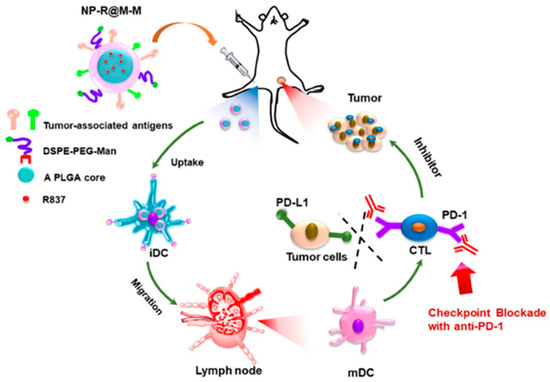 Schematic of the cancer cell membrane-coated, R837 loaded, and mannose modified poly(lactic-co-glycolic acid) (PLGA) nanovaccine for anticancer vaccination. Reproduced with permission from Ref [52], Copyright © 2018, American Chemical Society.