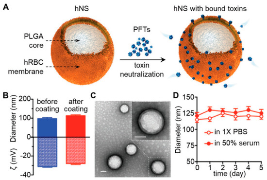 - Chen, Y.; Chen, M.; Zhang, Y.; Lee, J.H.; Escajadillo, T.; Gong, H.; Fang, R.H.; Gao, W.; Nizet, V.; Zhang, L. Broad-Spectrum Neutralization of Pore-Forming Toxins with Human Erythrocyte Membrane-Coated Nanosponges. Adv. Healthc. Mater. 2018, 7, 1701366. [Google Scholar] [CrossRef]