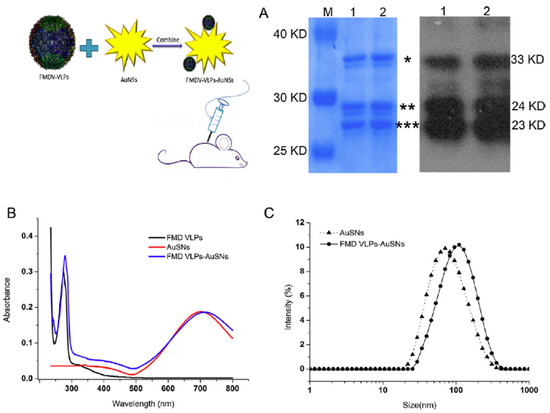 A) Schematic of the preparation of foot-and-mouth disease virus-like particle gold nanostars (FMD VLPs-AuSNs) complex. SDS page and western blot analysis FMD VLPs and FMD VLPs-AuSNs complexes; B) Fluorescent absorbance of the nanocomplex. C) Size distribution. Reproduced with permission from Ref. [144], Copyright © 2018 Elsevier Ltd. All rights reserved.