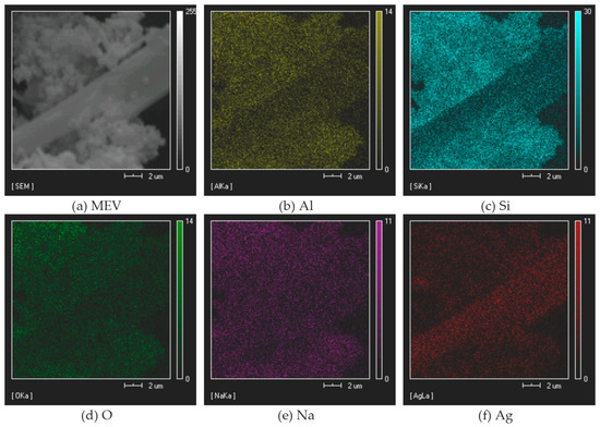 The divergence between the results recorded with TXRF and EDX was attributed to the capacity of TXRF to quantify the total silver bulk mass, whereas EDX quantifies silver up to a depth of 500 nm [25]. As reported by Boschetto et al. [26], EDX identifies the silver on the surface of the zeolite. Using ICP-OES (Inductively Coupled Plasma Optical Emission Spectroscopy) analysis, the authors observed that the real silver content approached the theoretical content while the amount of silver quantified by EDX was two-fold higher than the theoretical value, attributed to the higher Ag+ concentration on the external surface [26]. Important to mention is that ICP-OES analysis also provides the amount of bulk silver.