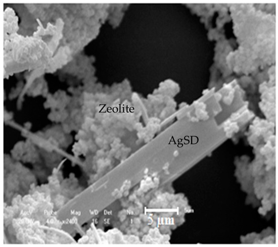 Silver sulfadiazine is a large molecule, and its morphology is modified when impregnated in the zeolitic support. Small “needles” of silver sulfadiazine with dimensions of 33.75 µm in length and 7.14 µm in width were observed.