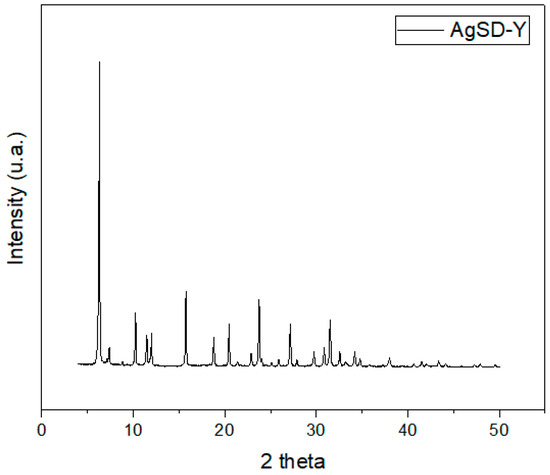 Zeolite samples were also analyzed by X-ray diffraction (XRD) by the powder method. The XRD pattern shown in Figure 3 was analyzed with the assistance of the Bank of JCPDS data. The characteristic peaks of FAU zeolite depicted in 2θ = 6.24°, 15.70°, 23.69°, 27.08° and 31.43° assigned, respectively, to the crystallographic planes [111], [331], [622], [624], [804] have already been observed in the zeolite NaY [14]. It would have been expected to detect the characteristic peaks of metallic silver at 38.21°, 44.51°, 64.51, and 77.51° in XRD diffractograms of the AgSD-Y (Figure 3). Some authors have even used several methodologies to incorporate silver in zeolite structures, which were then analyzed by XRD and no silver crystals could also be identified [26,27,28,29,30,31,32,33]. The fact is, not only AgSD exhibits a strong reflection at 2θ = 10.2°, but zeolite Y shows the very same peak [34].