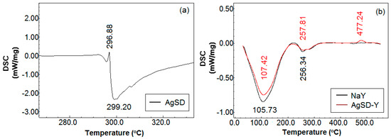 Heating curve of differential scanning calorimetry (DSC) of (a) pure AgSD and (b) NaY and AgSD-Y zeolite.