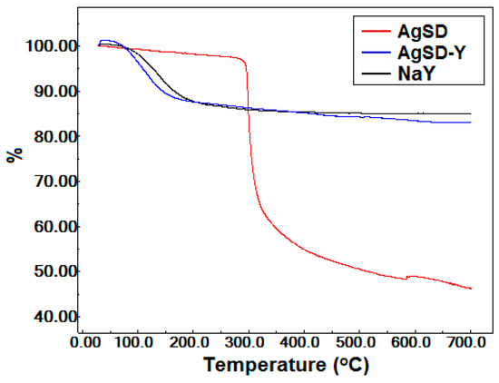 Thermogravimetric analyses (TGA) for silver sulfadiazine powder and zeolites are illustrated in Figure 5. Silver sulfadiazine exhibited a higher weight loss (~51%) between 250 °C and 350 °C, corresponding to its decomposition. Both zeolites (NaY and AgSD-Y) showed significant weight loss between 50 °C and 100 °C. The AgSD-Y sample had a higher total cumulative weight loss (17.16%) compared to the NaY zeolite (15.17%) up to 700 °C. The incorporation of silver sulfadiazine in the zeolitic support improved the hygroscopic character of AgSD-Y, resulting in increased water retention and lower stability.