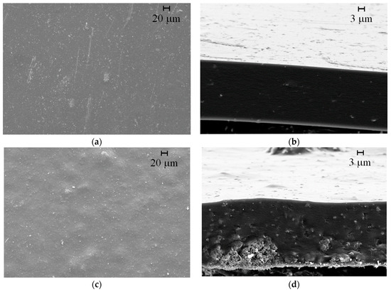 SEM micrographs of chitosan film (left: surface at magnification 500×); right: cross-section at magnification 3000×): AgSD/chitosan film (a,b); AgSD-Y/Chitosan film (c,d).