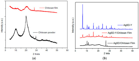 X-ray diffraction analyses were conducted to obtain information about the structures of chitosan powder, and pure chitosan film (Figure 8a). Furthermore, Figure 8b allows comparing the diffractograms of all the films and zeolite AgSD-Y as well.