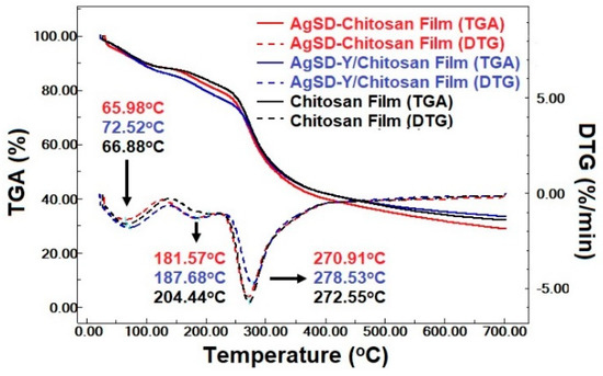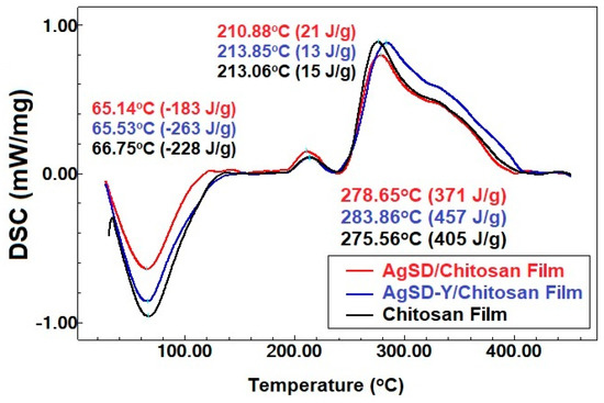 The heating curves showed the presence of three main peaks in all produced films (Figure 9), which corroborates previous findings [50,54,55]. The first one is an endothermic event attributed to water evaporation linked to the chitosan chain through physical bonds (hydrogen bonds, electrostatic interactions) [50,54,55]. It was recorded at 66.75, 65.53 and 65.14 °C, for chitosan film, AgSD-Y/Chitosan film and AgSD/Chitosan film, respectively. The second one is an exothermic event, observed at 213.06, 213.85 and 210.88 °C, respectively, for the chitosan film, the AgSD-Y/Chitosan film and the AgSD/Chitosan film. The third one is also an exothermic peak at 275.56, 283.86 and 278.65 °C, respectively, for the chitosan film, the AgSD-Y/Chitosan film and the AgSD/Chitosan film. Both the second and third peaks are associated with the decomposition of chitosan [56]. The addition of Ag-Clinoptilolite zeolites in chitosan films also increased the decomposition temperature of the films and decreased the evaporation temperature of water. Figure 9 shows that the incorporation of zeolite increases the heat of water evaporation enthalpy. The hydrogen bonds between hydroxyl groups of chitosan and the Si–O–Si groups of zeolite would compromise the interaction of the hydroxyl groups of chitosan with the water [13].
