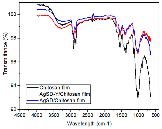 Infrared spectrum of the chitosan film, AgSD-Y/Chitosan film and AgSD/Chitosan film.